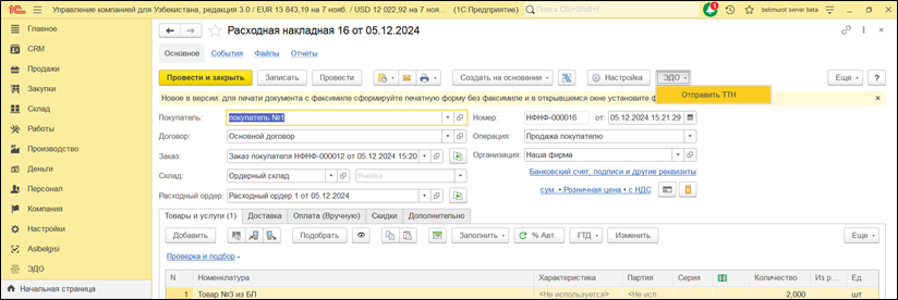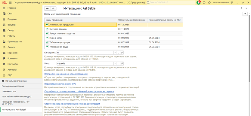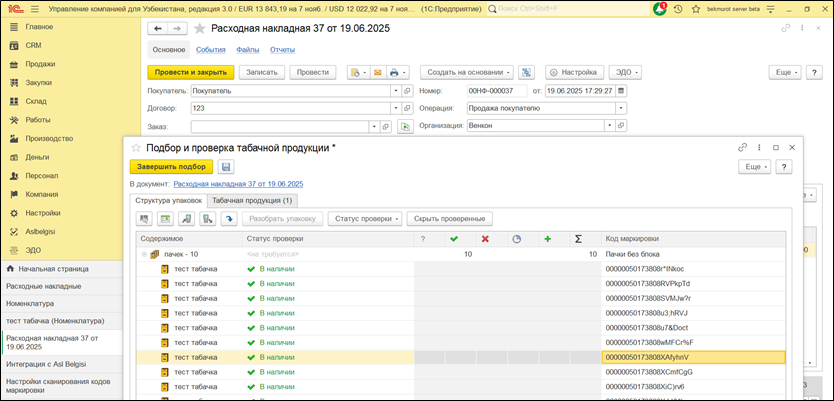 Функционал маркировки в системе «1С:Управление компанией для Узбекистана 3.0» включает в себя механизм проверки статусов кодов при продаже и отправке ЭСФ (электронный счет-фактура) в ЭДО.